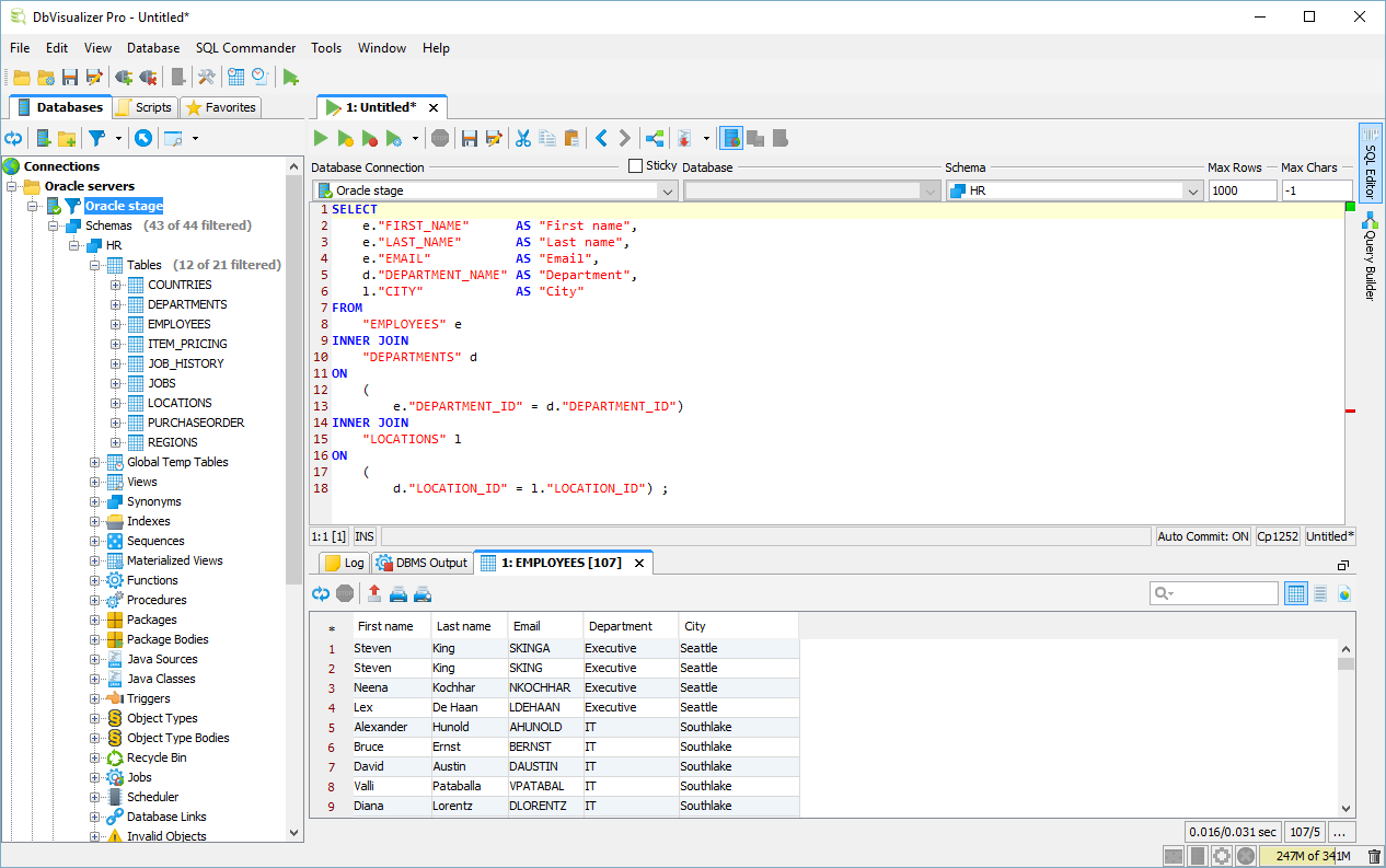 It can create display result data as a graph, which is great for data exploration. But among the coolest features are the ability to run the program from the command line, its support of its own parameter syntax as well as DBMS native syntax, and a mini-language specifying details of output formats. These last 3 points allow you to run a set of parameterized queries from a command-line script, totally automated, without a UI, saving the results in a specific output format. Very cool and very powerful, as it allows you to write a batch file or even better, use an ETL tool to automate multiple sequential queries. In other words, run nearly the entire process unattended. The DBViz support team also happens to be extremely responsive and constantly add features in response to user requests. For about $200, it’s no-brainer, given the huge productivity boost you’ll immediately experience.