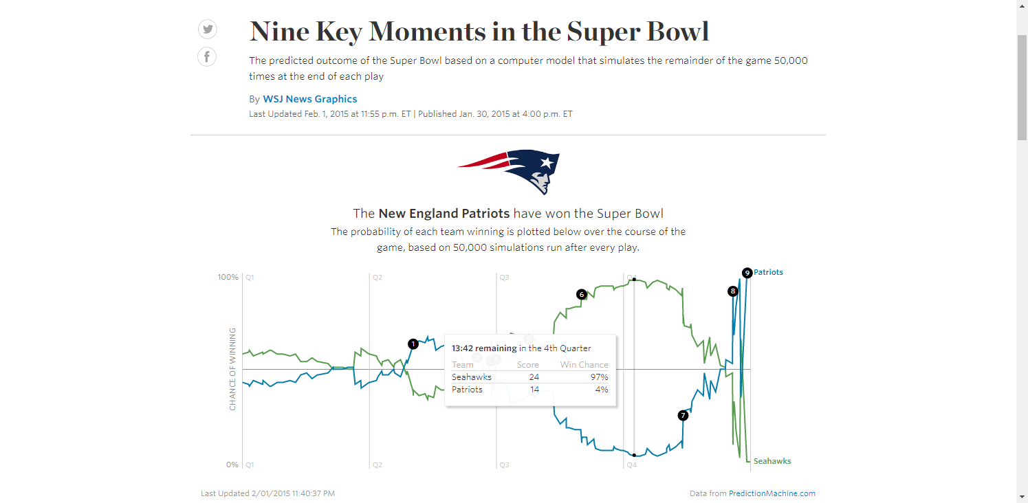 Suprisingly, Seattle's peak win probability was not right before the infamous 2nd-and-goal from the 1 at 0:26 that Malcolm Butler intercepted. Because the Seahawks were down by 4 and needed a touchdown, PredictionMachine.com estimated their WP at just 64% (although Andrew Healy makes a good argument it was 87%). According to the model, Seattle's peak WP was at 13:42 in Q4, on offense, leading 24-14. Seattle was above 90% starting from 3:23 in the 3rd Qtr until 8:06 in the 4th, when Tom Brady converted a 3rd-and-8 via a 21-yard completion to Julian Edelman, reaching the Seattle 4. ↩