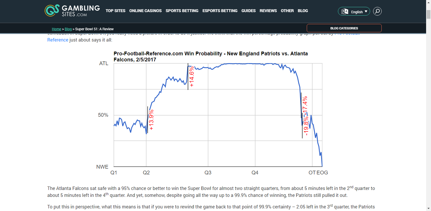 - Lopez only analyzed one model, Lock & Nettleton. And it performed better than most during the Patriots-Falcons Super Bowl, never reducing New England’s WP below 1% (100:1 odds). We can’t do the same analysis of the proprietary WP models, but there’s good reason to think those models are more over-confident than Lock & Nettleton at the extremes.