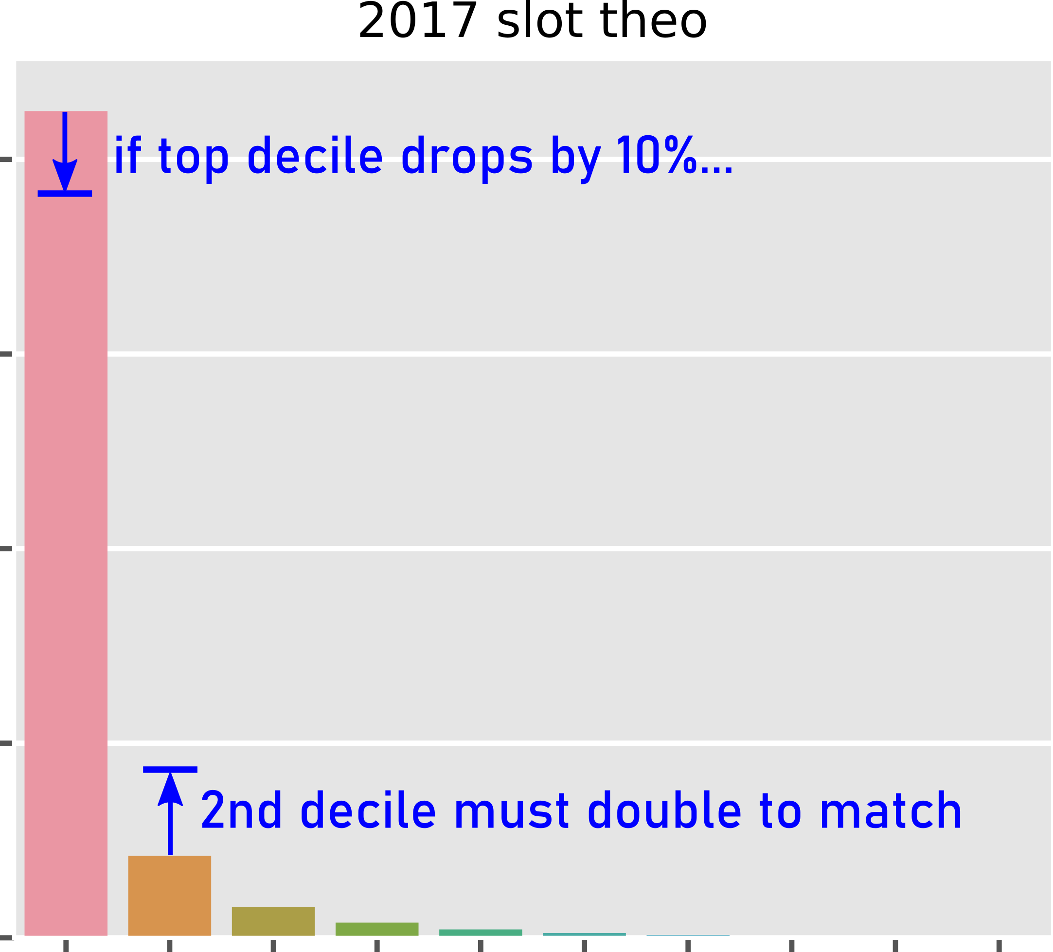 Of course, having a loyal group of top-tier players is great. But it comes with responsibility. In order for your casino to remain successful and grow revenue, this group of players must be developed, nurtered and catered to. If this group experiences a decline in visitation or spend, it's highly unlikely that any other segment can grow enough to offset the losses. Think about it, if the first decile declines by 10%, the 2nd decile would need to double to make up that gap.